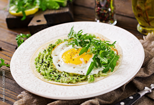 Tacos with guacamole, fried egg and arugula. Healthy food. Useful breakfast.