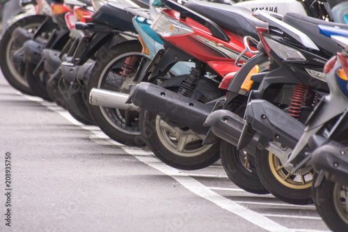 Taipei, Taiwan - June 10, 2018 : A row of motorcycle parking along the roadside in Taipei's street, Taiwan