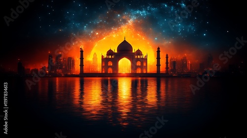taj, mahal, silhouette, city landscape, sunset, fiery, orange, red, night, sky, star, nebula, cosmos, water, architecture, mosque, islam, india, historical building, building, city, modern, ancient, contrast, dramatic, vibrant, colours, glow, light, dark, mystical, magical, serene, peaceful, majestic, beauty, wonder, incredible, breathtaking, awe, inspiring, spiritual, faith, religion