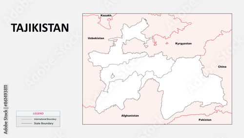 Tajikistan Map. Political map of Tajikistan with State border in outline. Political map of Tajikistan with outline and neighbouring countries.