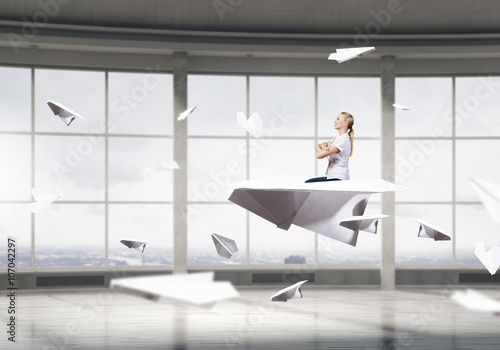 woman, interior, office, room, modern, businesswoman, break, cheerful, fun, optimist, careless, positive, window, career, concept, paper, plane, origami, race, aero, air, aeroplane, aviation, business, craft, female, flight, fly, freedom, hand-made, idea
