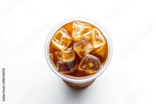Takeaway plastic cup with iced cold coffee drink isolated on white background, Top view , ai