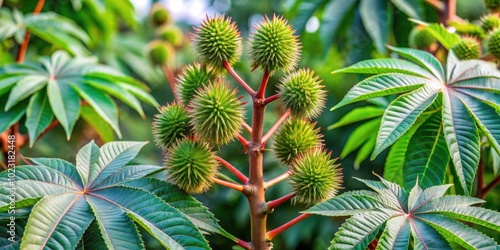 Tall and vibrant castor oil plants with large leaves and clusters of spiky seed pods, tropical, agriculture, plant, nature