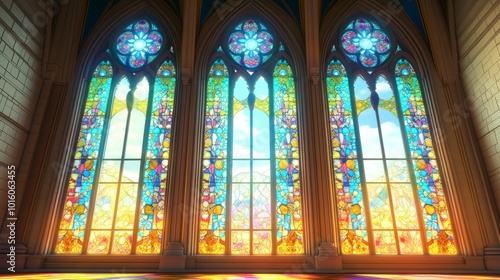 Tall arched windows in a spiritual building, featuring intricate stained glass patterns, conveying a sense of serenity and faith