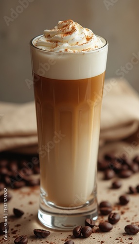 Tall glass of latte with whipped cream and cocoa powder indoors