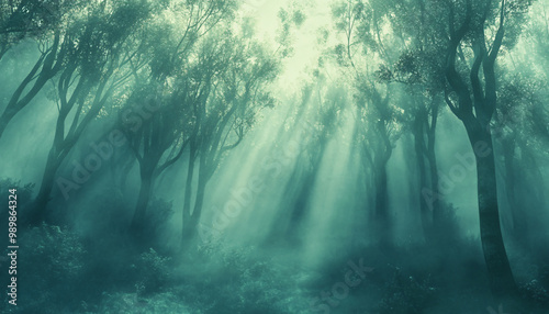Tall, misty trees with sunlight streaming through the branches, creating a magical and mysterious forest atmosphere