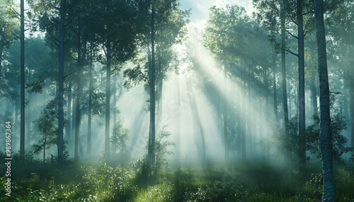 Tall, misty trees with sunlight streaming through the branches, creating a magical and mysterious forest atmosphere