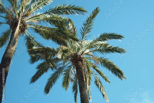 palm, tree, blue, sky, sunny, tropical, nature, green, leaf, summer, sunlight, vacation, foliage, clear, bright, day, exotic, tranquil, tall, background, travel, landscape, warm, paradise, tree, botanical, scenery, natural, serene, vibrant, holiday, lush, towering, peaceful, refreshing, coastal, picturesque, calm, horizon