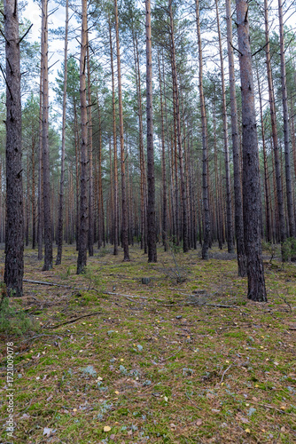 tall pine in a coniferous forest in the autumn season during leaf fall, changes in nature during the autumn season in a forest with old and tall pines