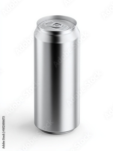 Tall, sleek, silver aluminum beverage can with pull tab top isolated on white background with subtle shadows for packaging and drink container design