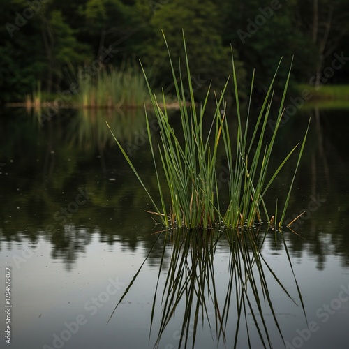 Tall, slender cane plants emerge gracefully from calm pond waters, their vertical lines reflecting in the peaceful surface. Lush aquatic flora thrives ,natural light ,pond ,riparian
