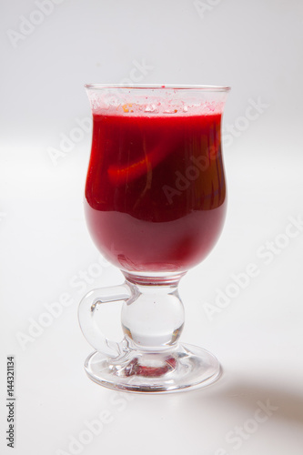 Tall transparent glass with raspberry and citrus tea.