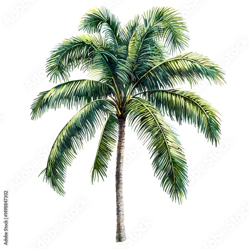 Tall tropical palm tree with lush green fronds and a sturdy brown trunk isolated on white background, perfect for tropical landscapes, outdoor decor, and botanical design