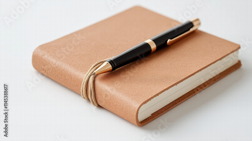 notebook, journal, pen, leather, tan, black, gold, writing, office, stationery, desk, minimalist, rustic, textured, string, bound, closeup, white background, still life, elegant, sleek, planning, organisation, office supply, diary, book, paper, page, study, work, business, creative, design, composition, simple, clean, neutral, natural, brown, metallic, smooth, object, product, detail