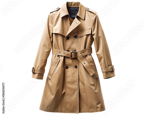 Tan trench coat with belt on white space isolated on white background, PNG. AI Generated