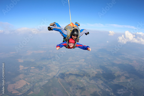 Tandem skydiving. Physically challenged woman is flying in the sky.