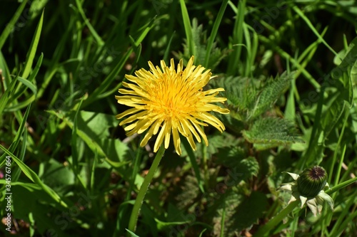 Taraxacum Officinale, yellow Dandelion flower in green grass.