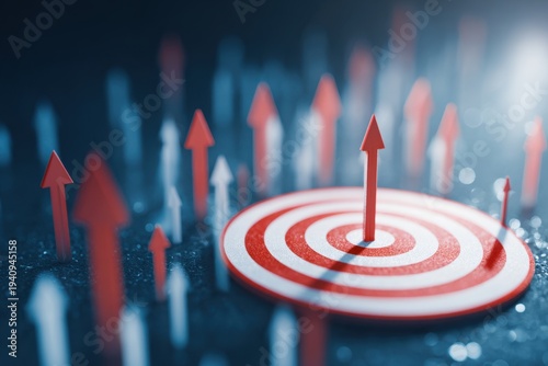 Targeting Success: An artistic view of a target with numerous arrows pointing towards it, symbolizing goals, aims, and achievements. Focus is on the bulls-eye, surrounded by a multitude of arrows.