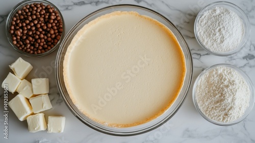 tart, ingredient, butter, filling, flour, chocolate, baking, dessert, receipe, preparation, glasses, bowl, marble, food, sweet, pastry, topping, chocolate chips, delicious, homemade, ready, mix, creamy, pale, yellow, brown, white, small, medium, topview, kitchen, cooking, prepared, simple, easy, custard