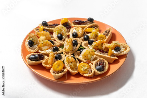 Tartlets with cream cheese, shrimps and black olives, decorated with kumquat.