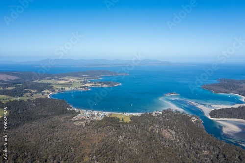 tasmanian coastal landscape in australia. aerial photos of rocky ocean views in southern tasmania. showing towns and farms.