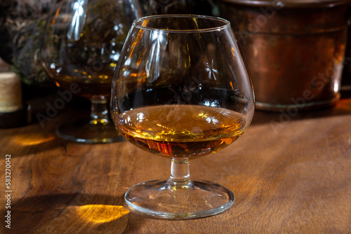 Tasting of aged french cognac brandy alcoholic drink in old cellars of cognac-producing regions Champagne or Bois, France