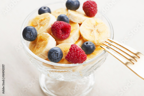 Tasty breakfast of bowl with banana, blueberries and raspberries next to fork on tablecloth.