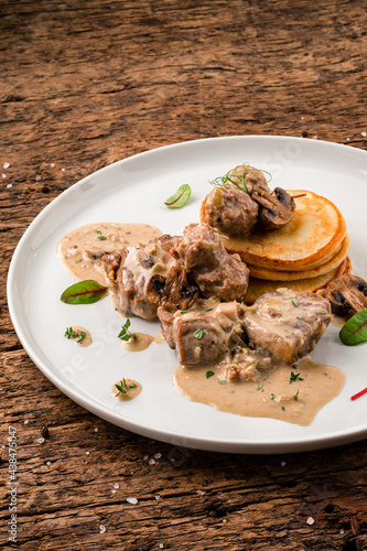 Tasty breakfast with fried eggs, pancakes and bacon on wooden background