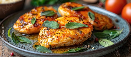 Tasty Chicken Steaks With Sage And Garlic Sauce Closeup On A Plate On The Table Chicken With Fried Sage Is A Haute Cuisine Dish
