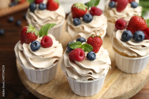 Tasty cupcakes with different berries and mint on wooden table, closeup