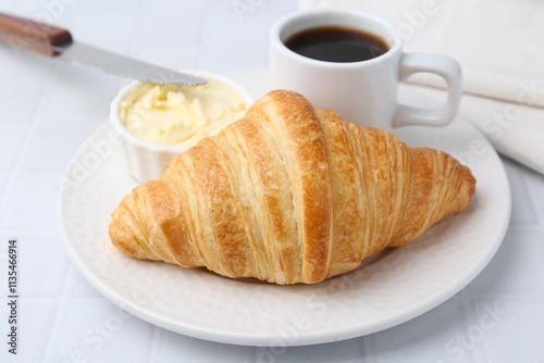 Tasty fresh croissant served with butter and cup of coffee on white tiled table, closeup