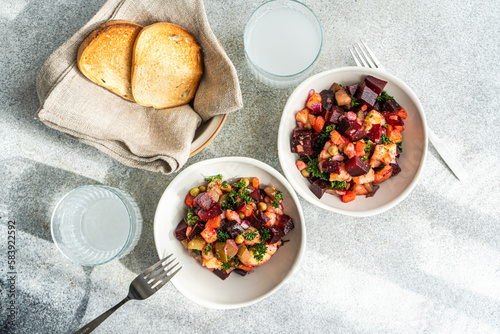 baked, beetroot, bowl, carrot, cucumber, diet, dinner, eat, eating, glasses, epicure, herb, ingredient, lose weight, lunch, mix, organic, parsley, potato, raw, salad, served, table, tasty, vegetable, vegetarian, vinaigrette, water, topview, from above, napkin, knife, fork, tablecloth, grey background, vegetable salad, healthy, bread, orange