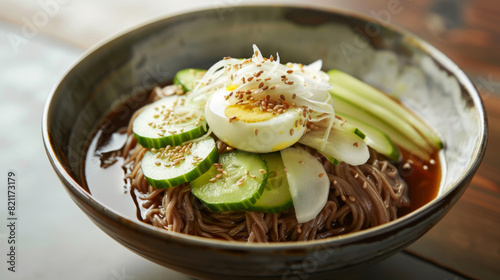 Tasty korean cold noodles with cucumber, boiled egg, and sesame seeds served in a wooden bowl