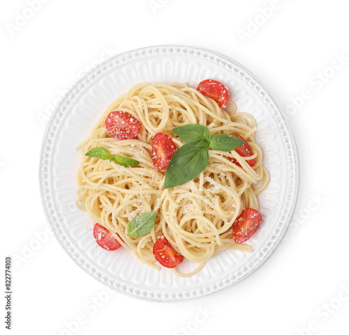 Tasty pasta with tomato, cheese and basil isolated on white, top view