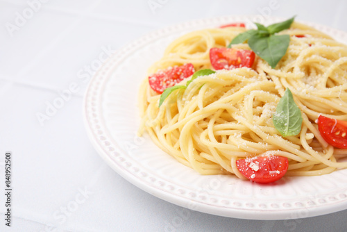 background, basil, carbohydrate, cheese, closeup, colours, cook, cooked, cooking, cookery, culinary, delicious, diet, dinner, dish, eating, food, fresh, epicure, homemade, hot, ingredient, italian, kitchen, lunch, macaroni, meal, nutrient, nourishment, object, parmesan, pasta, plate, portion, receipe, eatery, space, spaghetti, table, tasty, tiled, tomatoes, traditional, vegetarian, white
