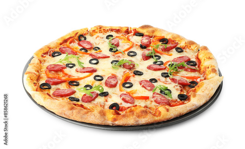 Tasty pizza with cheese, dry smoked sausages, olives, pepper and arugula isolated on white