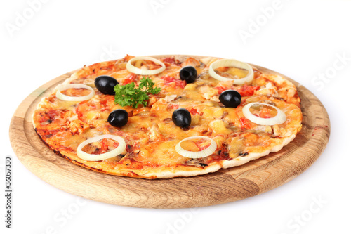 tasty pizza with olives on wooden stand isolated on white