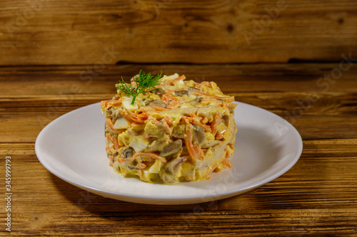Tasty salad with chicken breast, roasted mushrooms, carrots, grated cheese, eggs and mayonnaise on wooden table