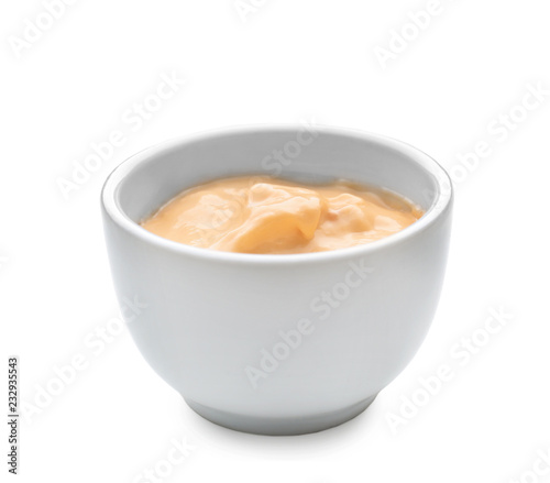 Tasty sauce in bowl on white background