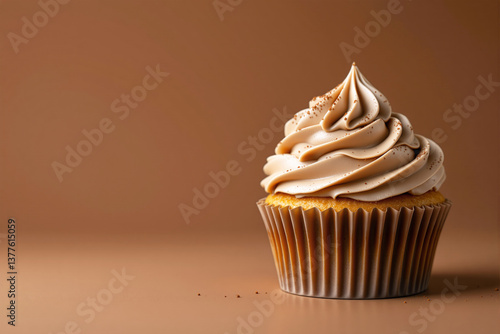 Tasty vanilla cupcake with smooth swirled frosting, photorealistic style, on soft brown background. Concept of dessert, sweet food and baking. Ai generative