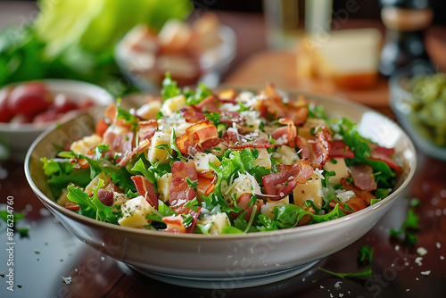 Tasty vegetables veggies salad with bacon, cheese, and egg