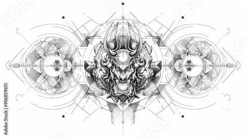 tattoo art line, illustrated in illustrator, perfect generation without design errors, pure white and clean background, A geometric and realistic style tattoo, featuring a combination of mythological.