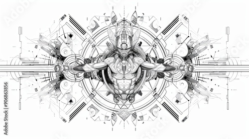 Tattoo art line, illustrated in Illustrator, perfect generation without design errors, pure white and clean background. A geometric and realistic style tattoo, featuring a combination of mythological.
