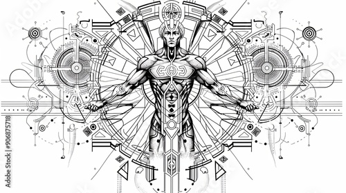 tattoo art line, illustrated in illustrator, perfect generation without design errors, pure white and clean background, A geometric and realistic style tattoo, featuring a combination of mythological.