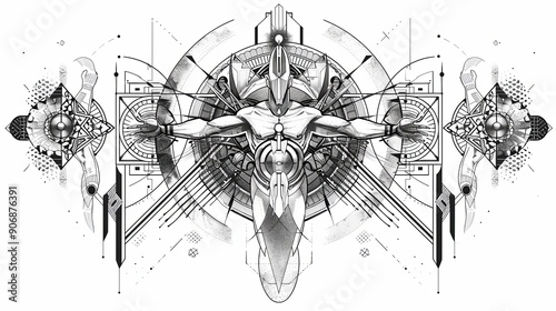 tattoo art line, illustrated in illustrator, perfect generation without design errors, pure white and clean background, A geometric and realistic style tattoo, featuring a combination of mythological.