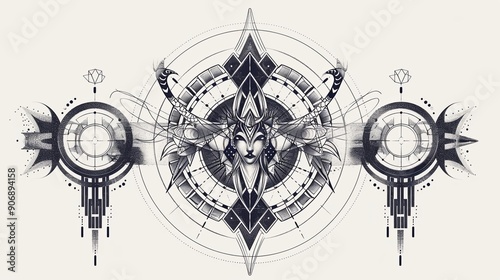 tattoo art line, illustrated in illustrator, perfect generation without design errors, pure white and clean background, A geometric and realistic style tattoo, featuring a combination of mythological.