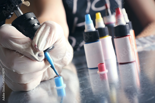 art, black, blue, closeup, colours, concept, create, creative, design, device, drawing, electric, equipment, expression, female, glove, hand, health, holding, human, hygiene, indoor, infection, ink, iron, lifestyle, machine, mechanical, metal, motor, needle, needle, pain, paint, permanent, professional, steel, sterile, studio, table, tattoo, tattooed, tattoo artist, tool, vibrate, view, white, woman, work
