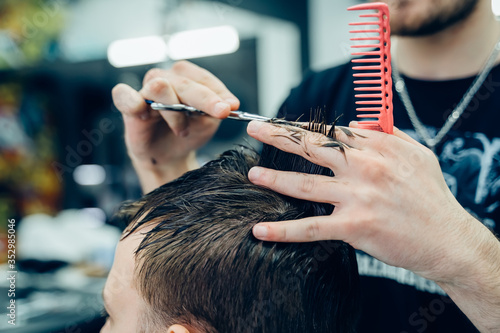 Tattooed Barber cuts the hair of the client with scissors. Close up. Attractive male is getting a modern haircut in barber shop. Close up view.