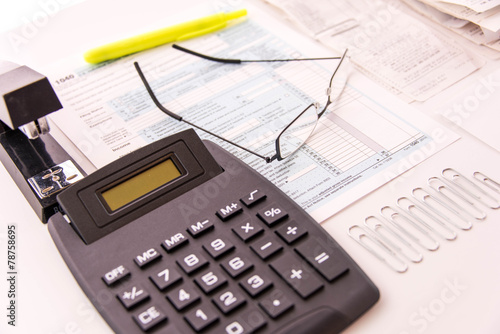 Tax preparation supplies, reading glasses and tax forms