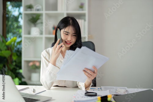 Tax Report Communication. A professional woman engages on a call while reviewing tax documents.